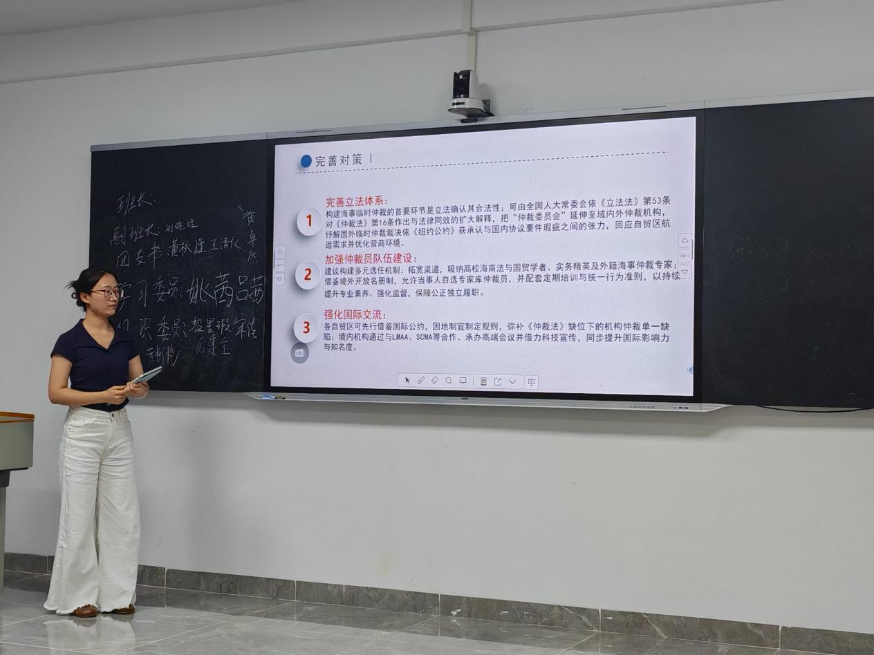 活动现场,24级研究生林蓓菁、谭卓篇、陈毅沅、郑清媛、陈小妹等五名同学依次登台发言,围绕为省法学会海洋法学研究会、航运法学研究会2025年会员大会与学术年会所撰写的学术论文展开分享。活动采取一报告一交流的方式渐次展开。作者详细介绍了论文的研究背景、问题的提出,分析过程、解决对策与论证逻辑,引发了现场热烈讨论。刘澍副院长对论文进行点评,尤其是对其中的关键问题,结合同学们的交流内容进行了简要地解释,阐释了问题的由来,讲解相关法律制度的内涵及实践情况,有效拓展了同学们的学术视野与专业认知。